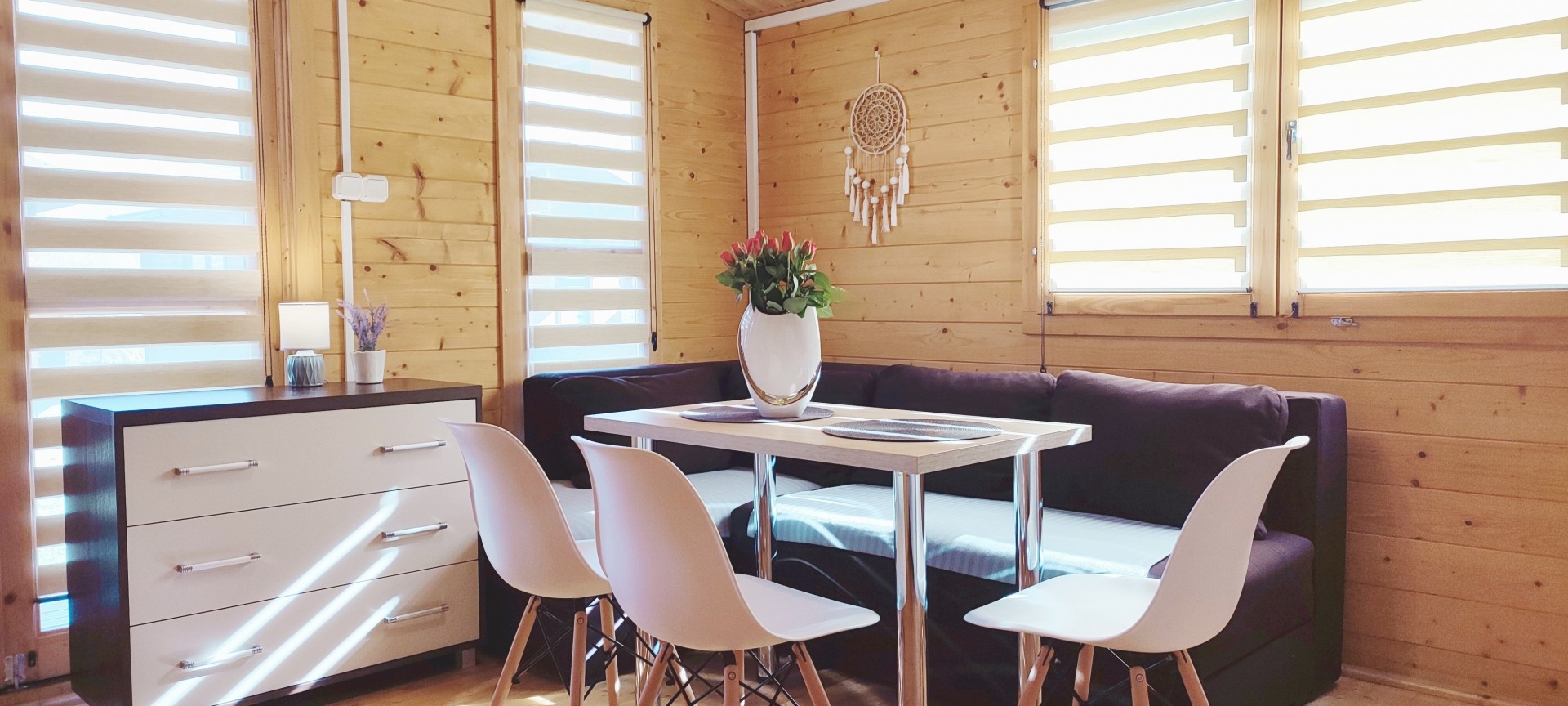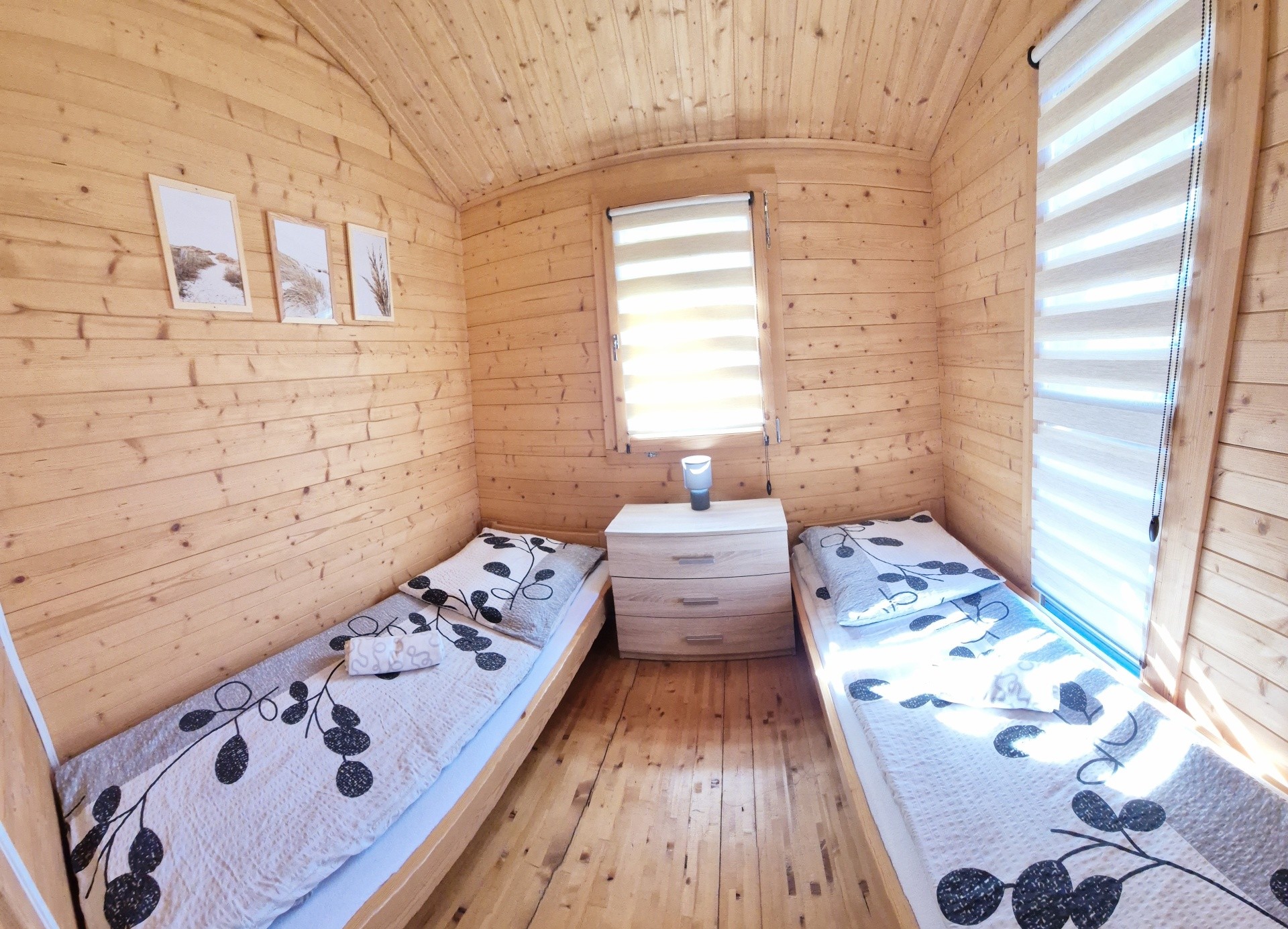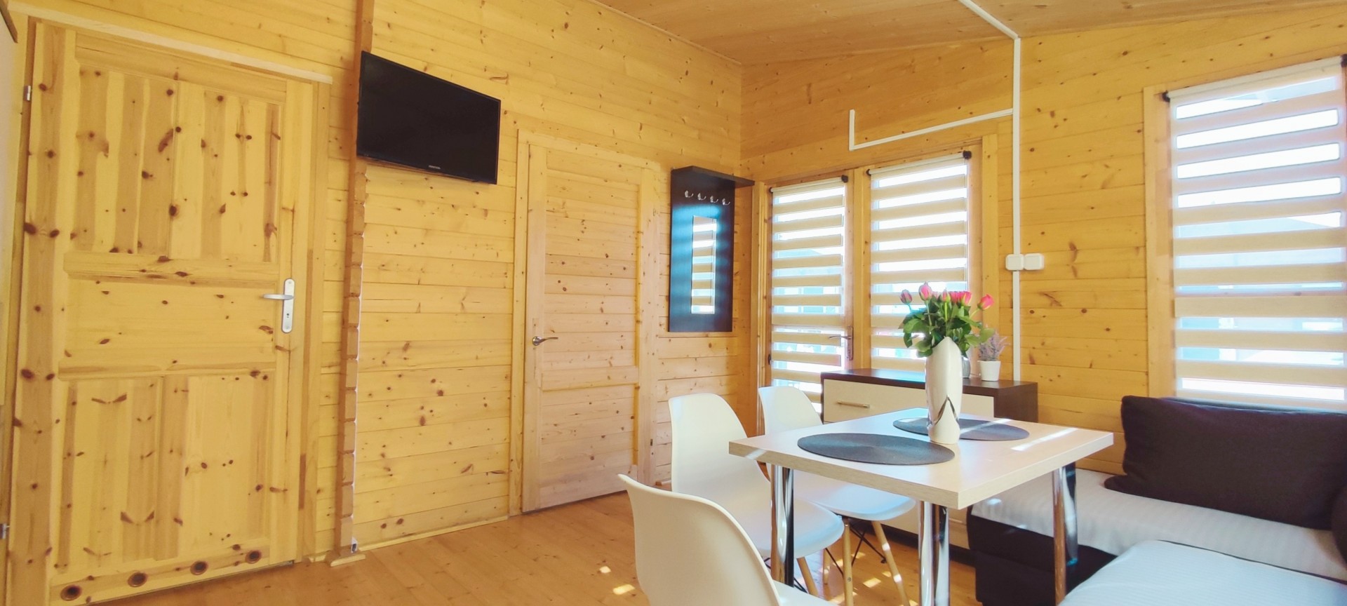 W każdym domku salon z aneksem kuchennym, niezależna sypialnia dwuosobowa, łazienka i taras.