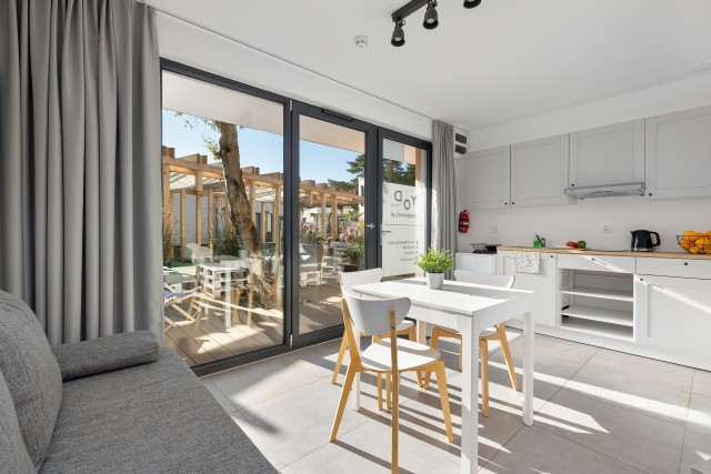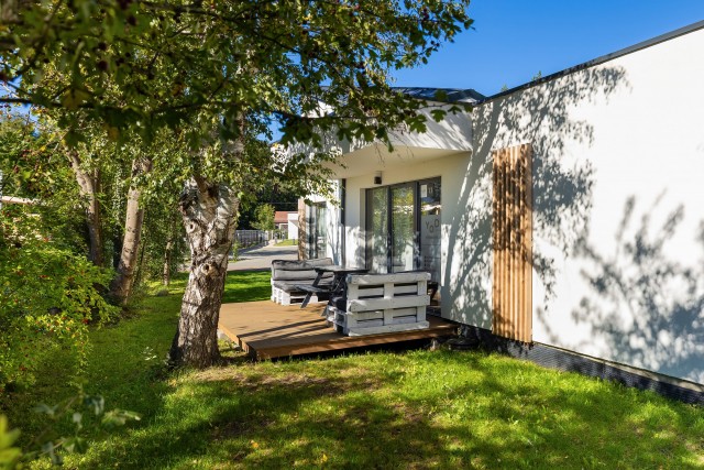 Domek 2-3 osobowy to kameralny parterowy domek o powierzchni 22-24 m2 z osobnym wyjściem na przestronny (15m2) dedykowany dla domku taras. Domek 2-3 osobowy jest idealny na wakacyjny wypoczynek dla pary lub pary z dzieckiem. W środku goście mają do dyspozycji wygodny salon, gdzie znajdzie się miejsce do wypoczynku i wspólnego spędzania czasu. W pełni wyposażona kuchnia z jadalnią pozwala na przygotowywanie codziennych posiłków, a także zachęca do kulinarnych eksperymentów. Po aktywnie spędzonym dniu wygodna, wydzielona zaciemniającą kotarą sofa w przestrzeni dla Rodziców, zapewni zasłużony i spokojny sen. Dla dzieci przewidziana jest rozkładana kanapa.