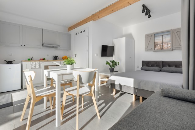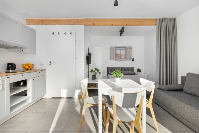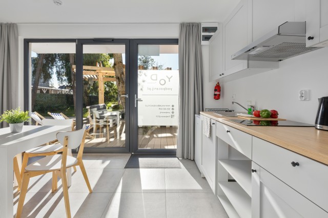 Domek 3-4 osobowy to przytulny parterowy domek o powierzchni 26-28 m2 z osobnym wyjściem na przestronny (15m2) dedykowany dla domku taras. Domek 3-4 osobowy jest idealny na wakacyjny wypoczynek dla rodziny z 2 dzieci. W środku goście mają do dyspozycji wygodny salon, gdzie znajdzie się miejsce do wypoczynku i wspólnego spędzania czasu. W pełni wyposażona kuchnia z jadalnią pozwala na przygotowywanie codziennych posiłków, a także zachęca do kulinarnych eksperymentów. Po aktywnie spędzonym dniu wygodne, wydzielone zaciemniającą kotarą dwa połączone łóżka jednoosobowe w przestrzeni dla Rodziców, zapewnią zasłużony i spokojny sen. Dla dzieci przewidziana jest rozkładana 2 osobowa sofa.